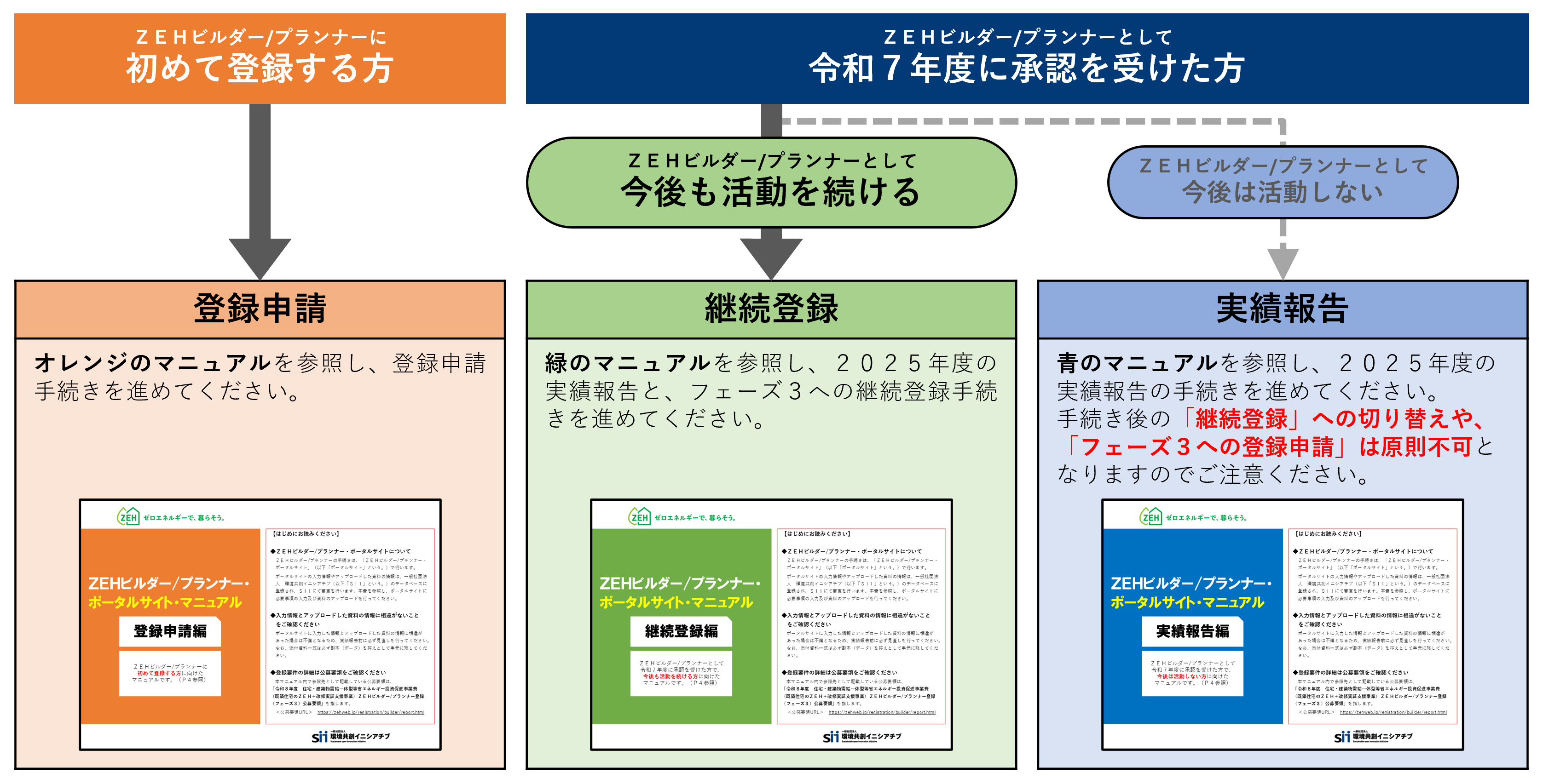 登録済みのZEHビルダー/プランナーは、2025年度実績の報告を行うと同時にフェーズ3への登録を行うことができます。(以下「継続登録」という。)
