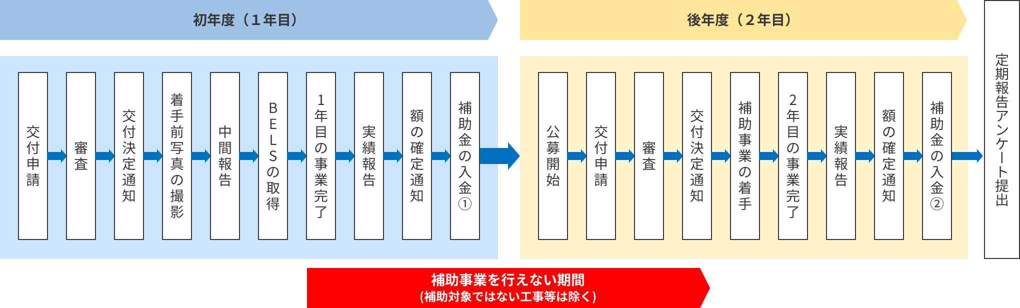 交付申請書類を受理した後、不備がなければ、およそ3週間で交付決定となります。なお、交付決定前の補助事業の着手(上記フローでは初年度のBELSの取得)は認められませんのでご注意ください。