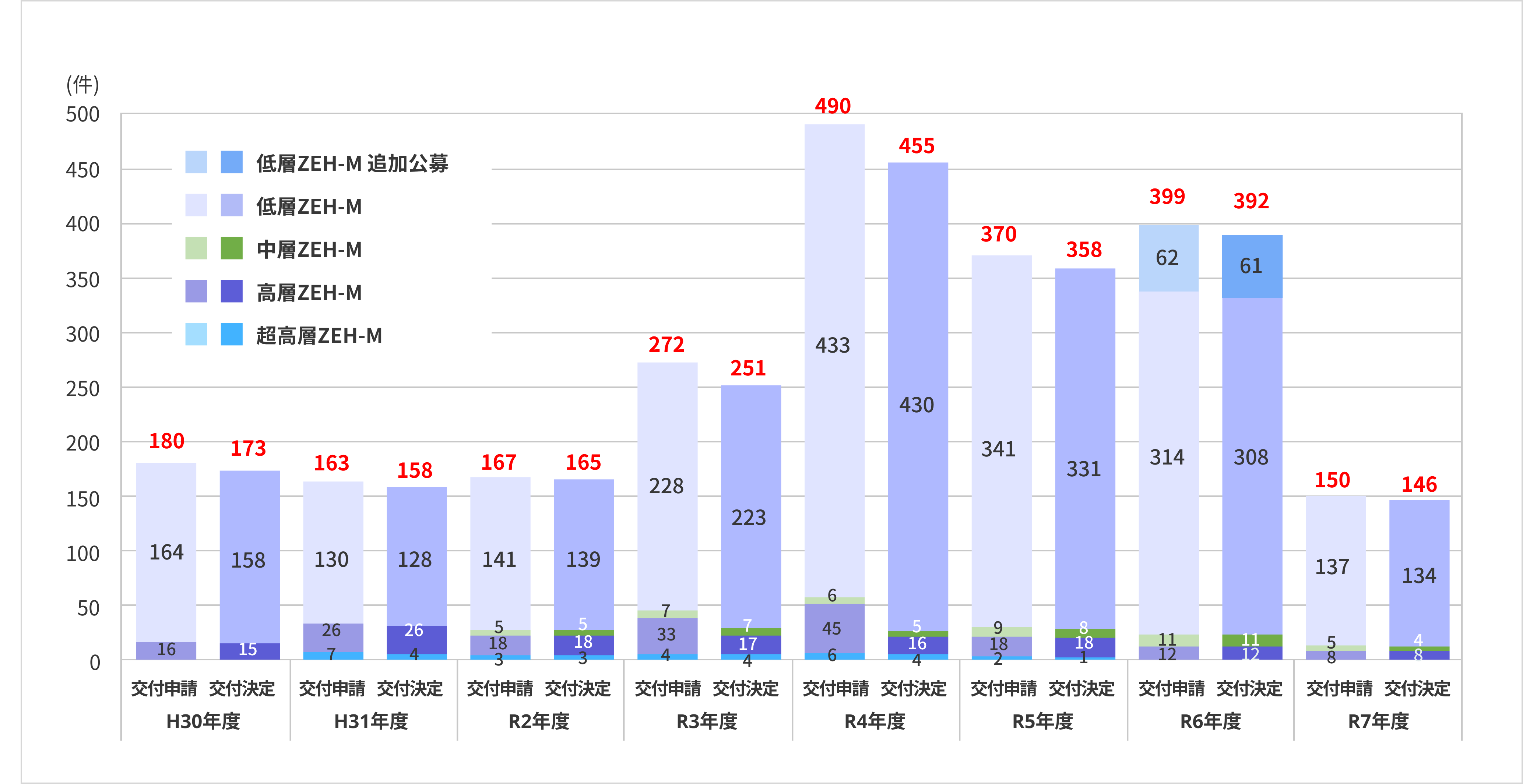 【集合ZEH-M:R7年度交付決定事業】交付申請件数と交付決定件数(新規採択)の推移