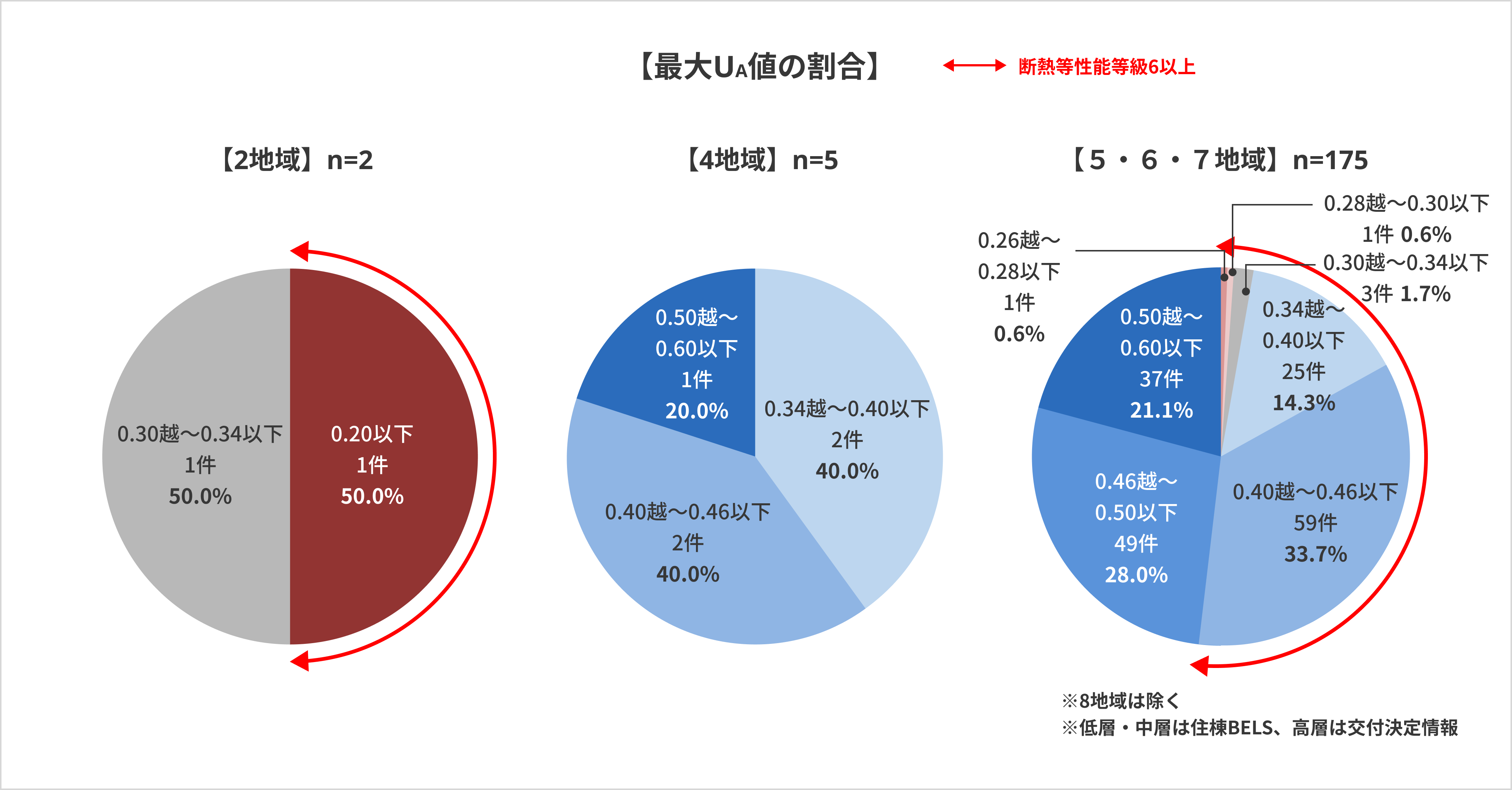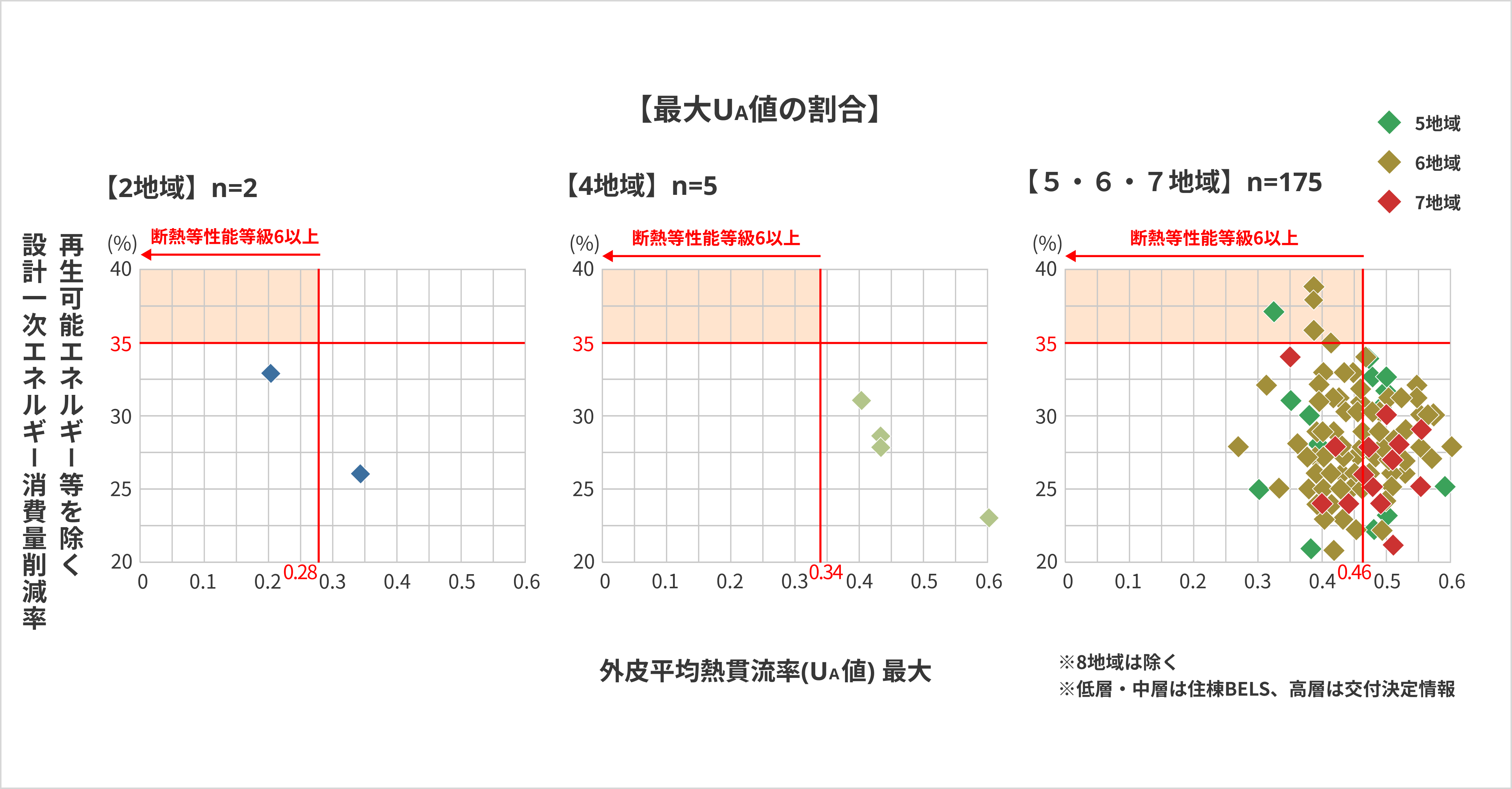 住棟を構成する全住戸のうち、最も大きいUA値が断熱等性能等級6以上を満たす事業は2地域では低層ZEH-Mで1件、5・6・7地域では低層ZEH-Mで86件、中層ZEH-Mで3件の全体で90件あり、前年の43.0%から6.5ポイント上昇し、49.5%でした。